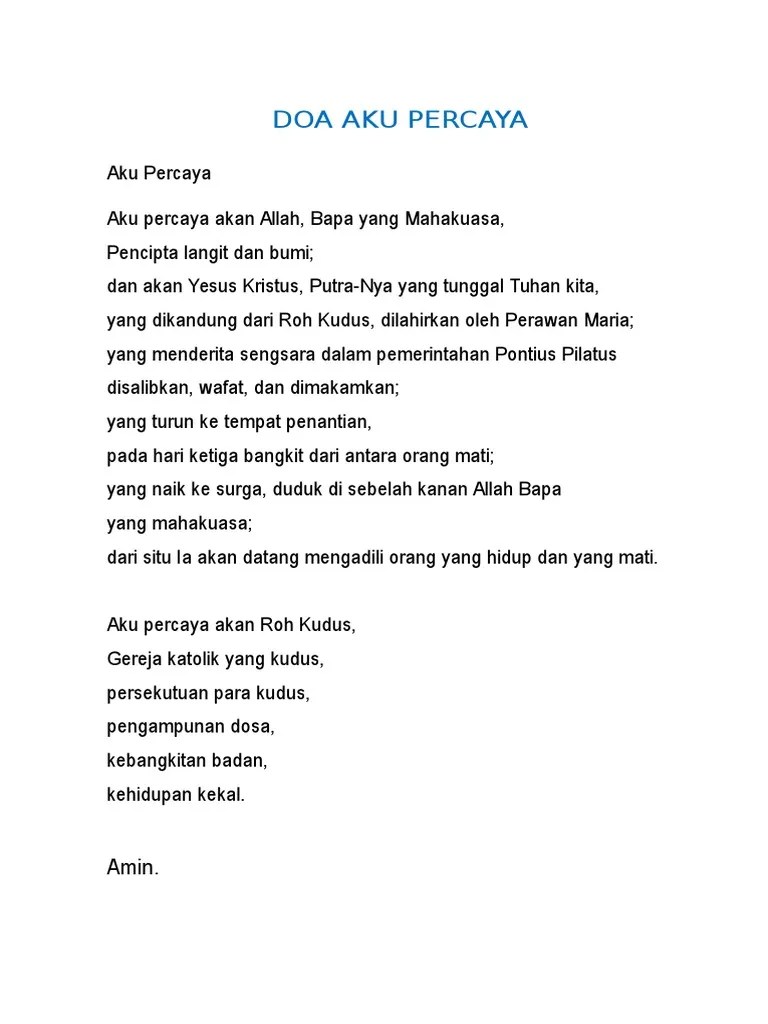 Arti dan makna doa aku percaya iman terhadap yesus. Aku mengakui satu pembaptisan akan penghapusan dosa. Ia bersabda dengan perantaraan para nabi. Aku percaya akan allah, bapa yang maha kuasa, pencipta langit dan bumi. Dan akan yesus kristus puteranya yang tunggal, tuhan kita, yang dikandung dari roh kudus,.